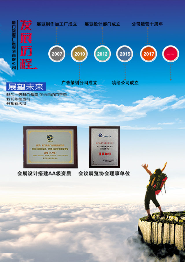 公司成立于2007年,前身為廈門柒度廣告制作加工廠,2010年正式更名為廈門柒度廣告策劃有限公司,注冊資金220萬實際到資220萬。我們是廈門廣告協會理事單位、廈門會議展覽協會理事單位、廈門會展設計搭建AA級資質企業。